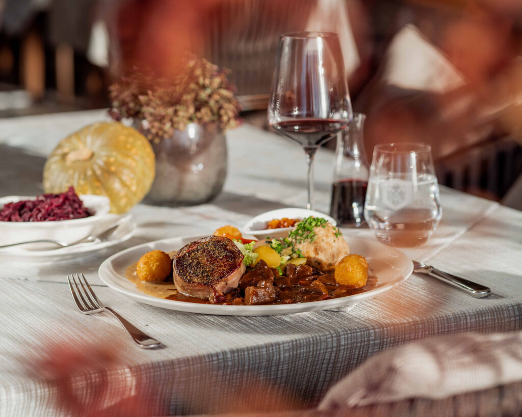 Wer wandert darf auch mit reinstem Gewissen genießen und muss nicht die Kalorien zählen. In unserem Restaurant ist die Kürbiszeit angebrochen. Egal ob als Ravioli oder eingelegt – es gibt Kürbis in allen Variationen. Unsere Traditionsgerichte, wie ein knuspriges Schnitzel oder ein zartes Gulasch finden Gäste natürlich immer auf unserer umfangreichen und saisonal variierenden Speisekarte. Um das Herbstfeeling auch ins Glas zu bringen, darf ein Gläschen Sturm nicht fehlen.
